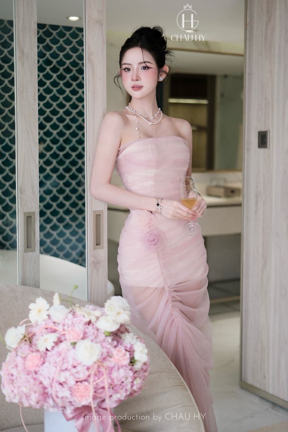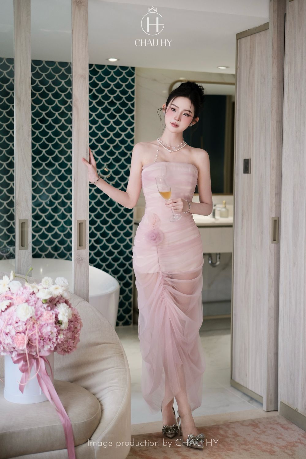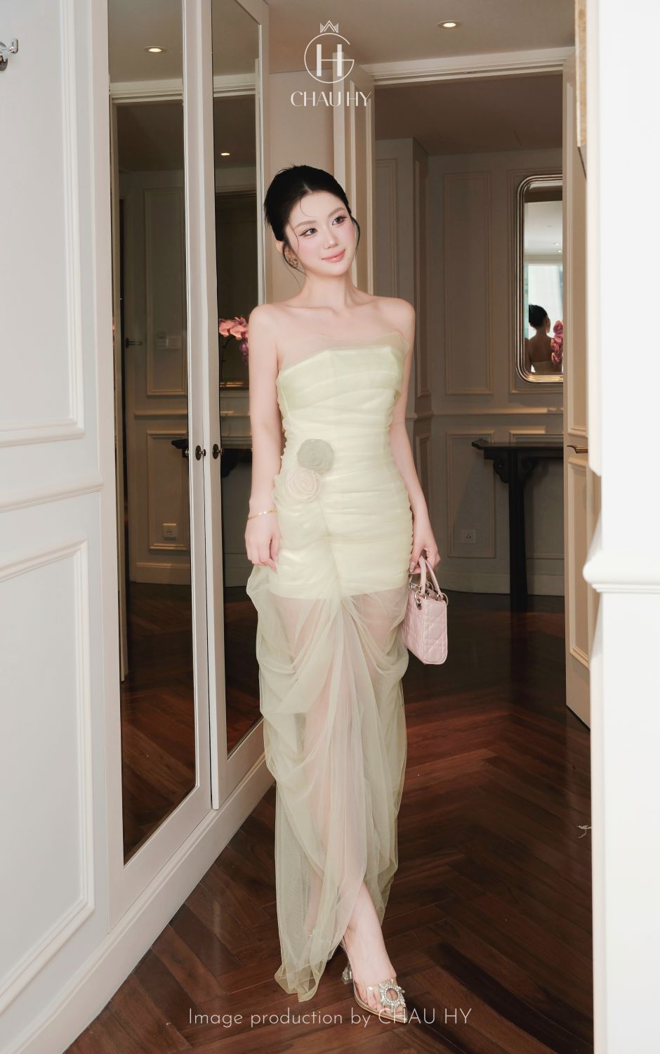 Chi Tiết Hoa Kép Thủ Công & Dải Voan Rủ: Điểm nhấn hoa kép (Double Rose) được làm tay tỉ mỉ tại eo, kết hợp cùng dải voan rủ bất đối xứng tạo hiệu ứng xuyên thấu (Sheer effect), giúp quý cô khoe khéo đôi chân thon dài một cách đầy bí ẩn và nghệ thuật.