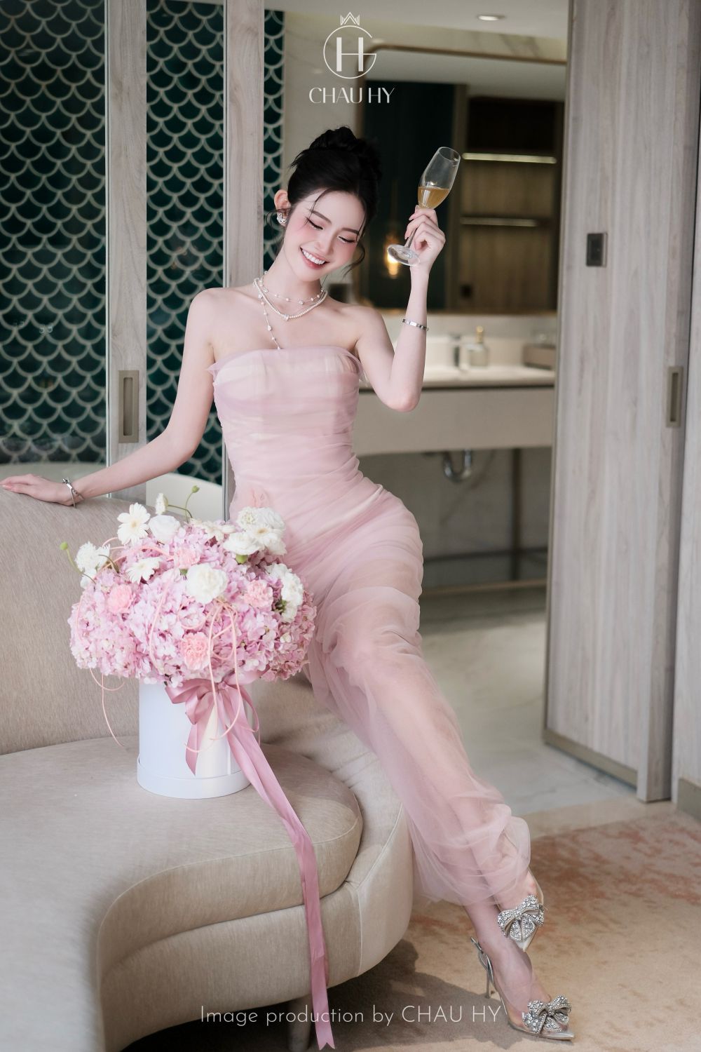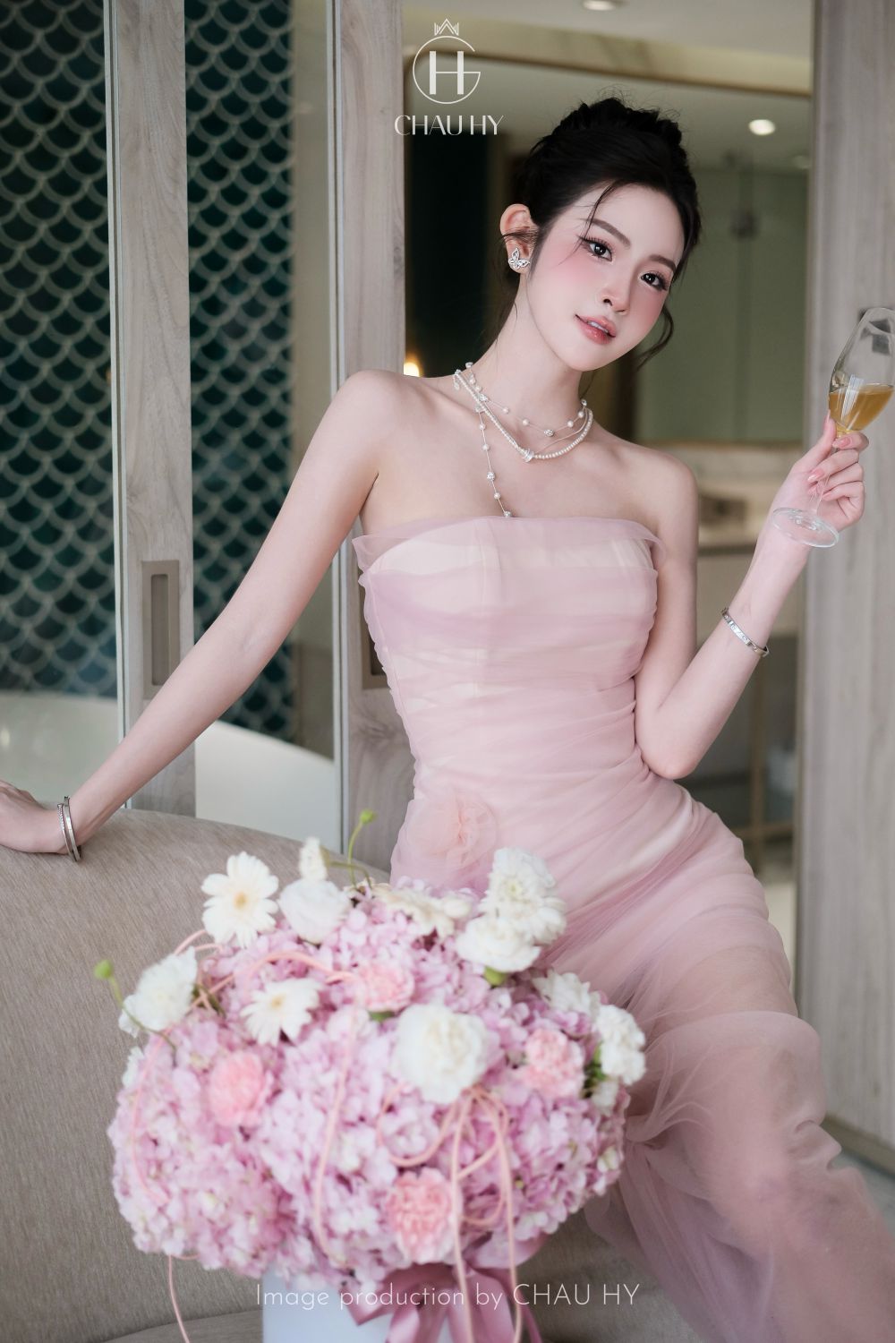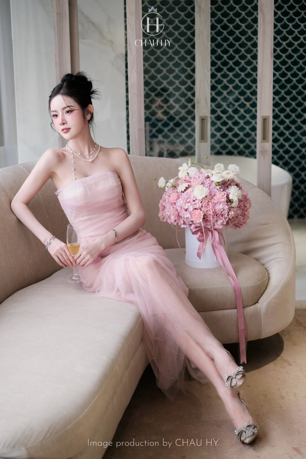 Chi Tiết Hoa Kép Thủ Công & Dải Voan Rủ: Điểm nhấn hoa kép (Double Rose) được làm tay tỉ mỉ tại eo, kết hợp cùng dải voan rủ bất đối xứng tạo hiệu ứng xuyên thấu (Sheer effect), giúp quý cô khoe khéo đôi chân thon dài một cách đầy bí ẩn và nghệ thuật.