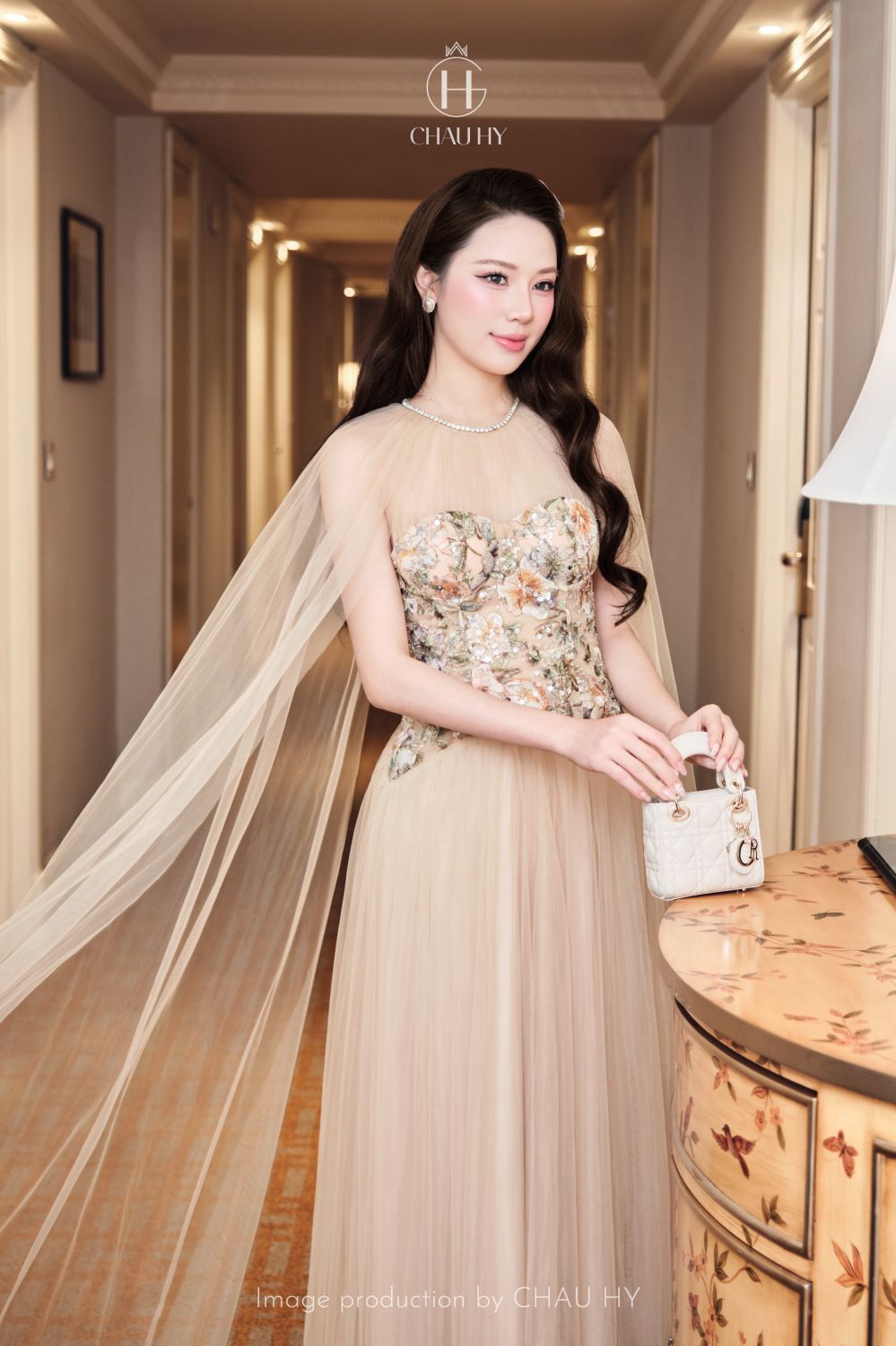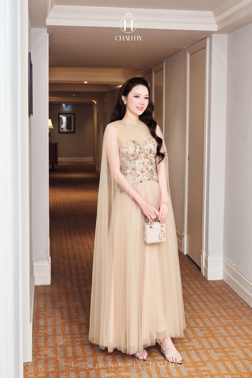 Thiết Kế Choàng Voan Tơ (Sheer Cape): Điểm nhấn áo choàng voan tơ mỏng nhẹ rủ dài từ cổ, bao phủ đôi vai một cách huyền ảo, tạo nên phong thái thoát tục, đầy quyền năng và che khéo khuyết điểm bắp tay một cách tinh tế.