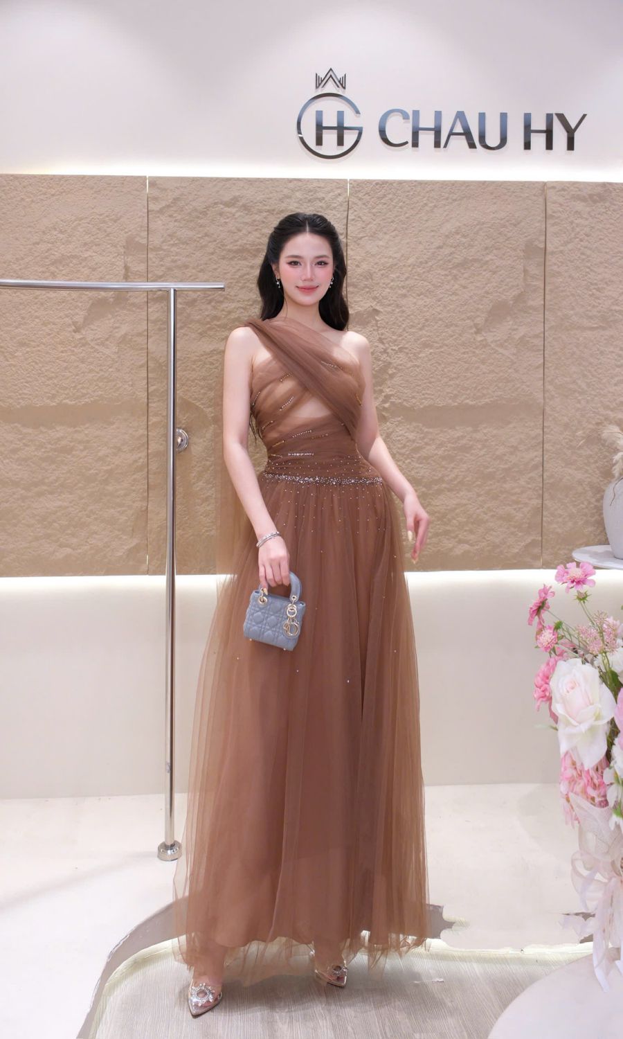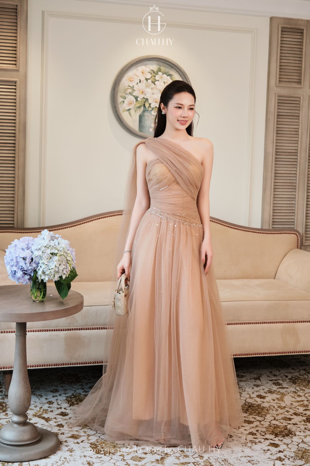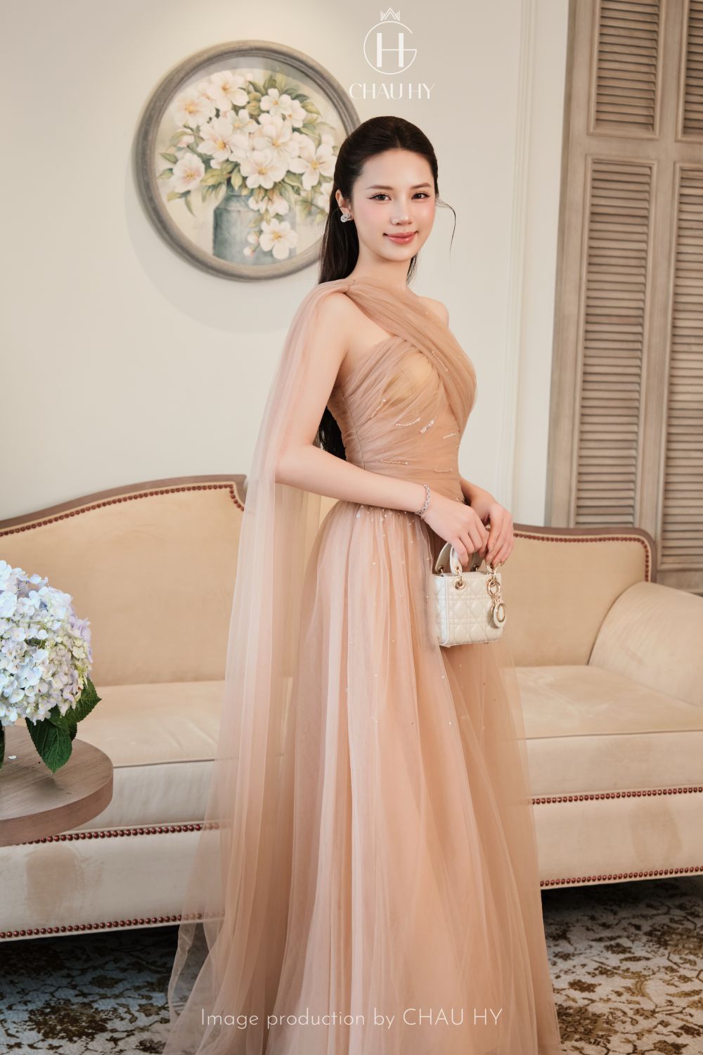 Kỹ Thuật Asymmetrical Draping: Dải voan tơ được xếp nếp thủ công, đan chéo lệch vai tinh tế, không chỉ tạo điểm nhấn uyển chuyển mà còn giúp tôn vinh bờ vai trần mảnh dẻ và vùng cổ thanh tú một cách đầy nghệ thuật.