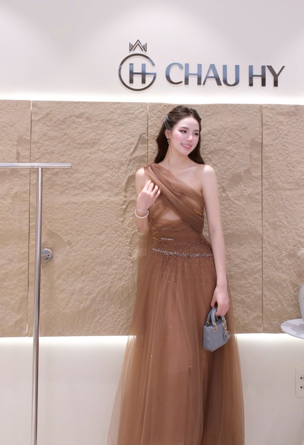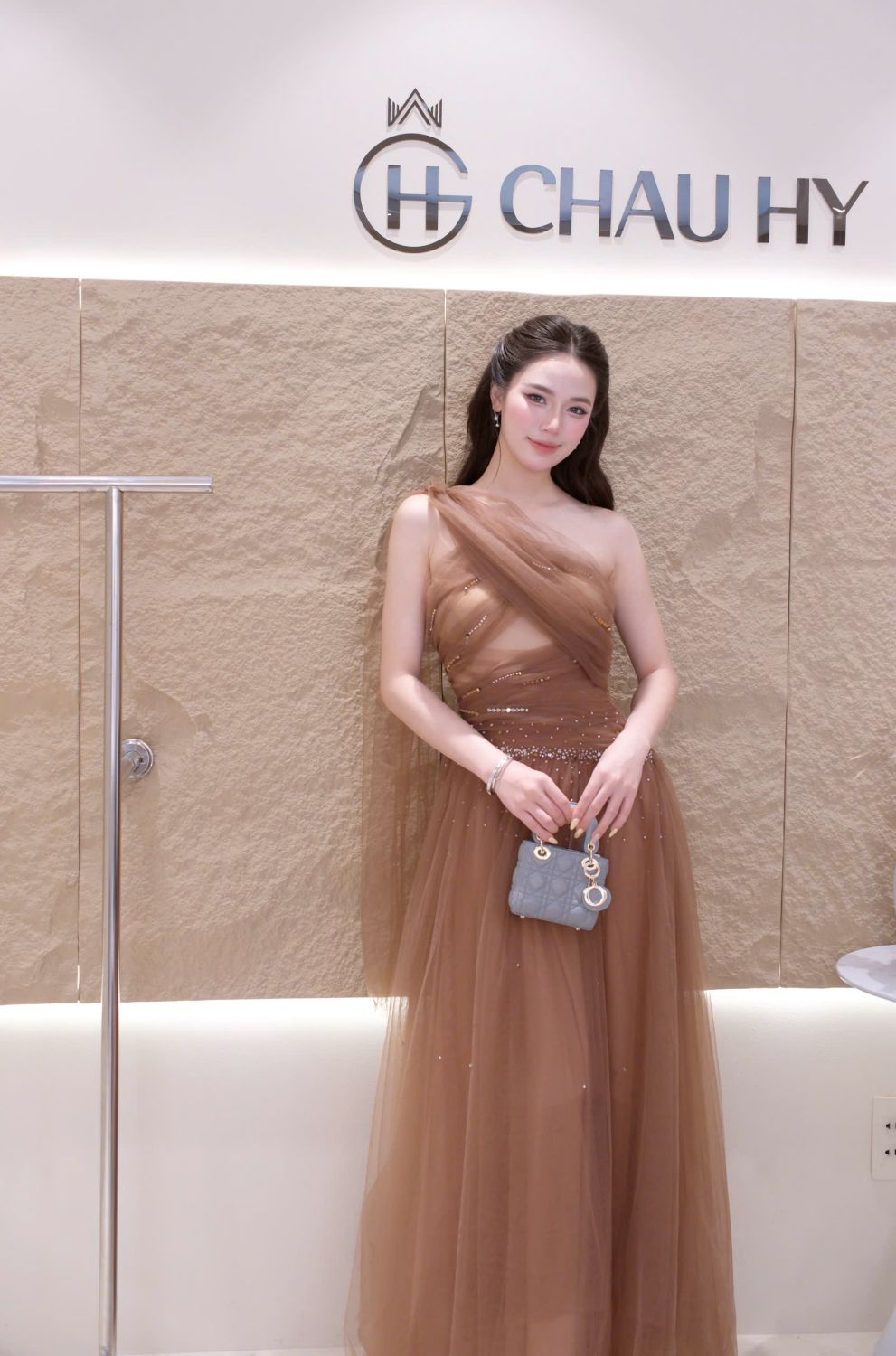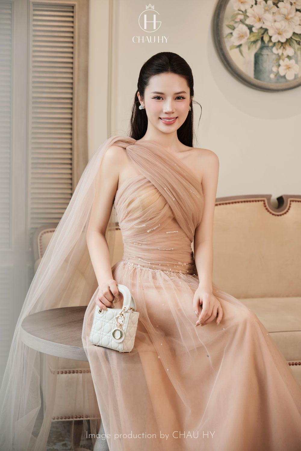 Kỹ Thuật Asymmetrical Draping: Dải voan tơ được xếp nếp thủ công, đan chéo lệch vai tinh tế, không chỉ tạo điểm nhấn uyển chuyển mà còn giúp tôn vinh bờ vai trần mảnh dẻ và vùng cổ thanh tú một cách đầy nghệ thuật.