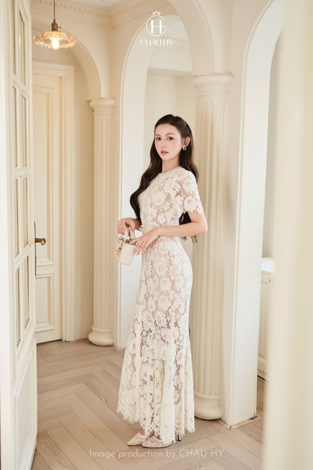 Chất Liệu Guipure Lace Thượng Hạng: Sử dụng dòng ren dệt nổi với họa tiết hoa văn đối xứng, mang lại chiều sâu cho trang phục. Sắc kem (Royal Cream) bắt sáng tự nhiên, giúp quý cô tỏa sáng rạng rỡ dưới ánh đèn dạ tiệc.