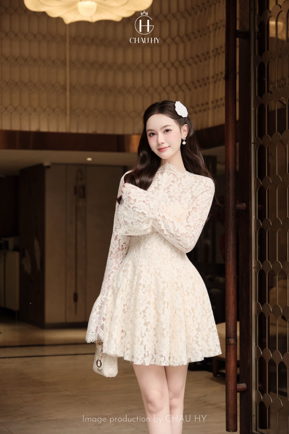 Chất Liệu Crochet-Lace Thượng Hạng: Sử dụng dòng ren thêu chỉ nổi cao cấp với họa tiết hoa văn đối xứng, bề mặt vải bắt sáng nhẹ nhàng, tạo chiều sâu và sự sang trọng ngầm cho trang phục.