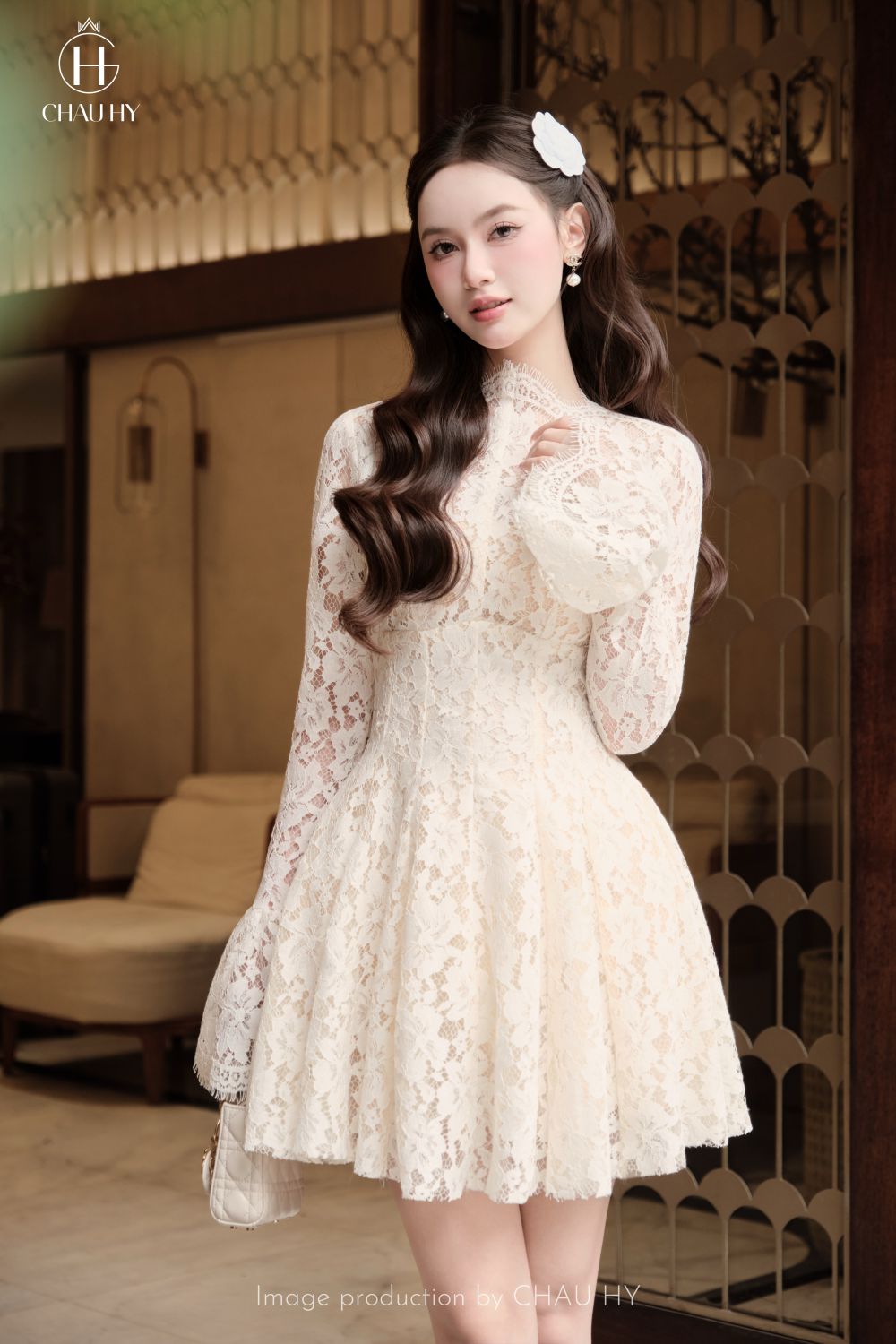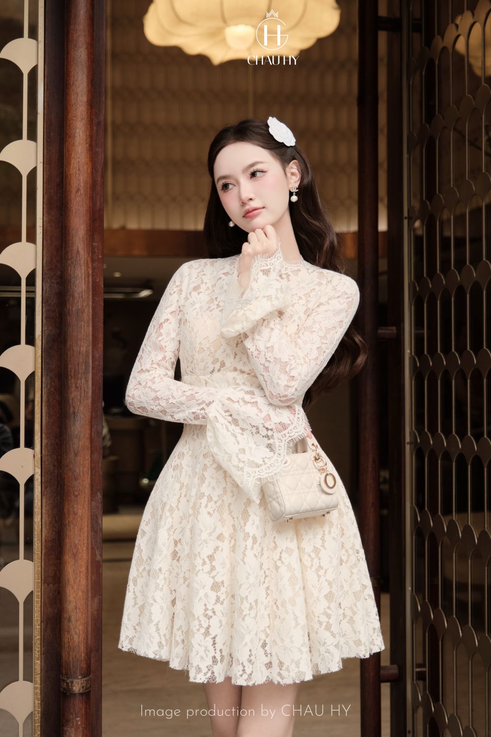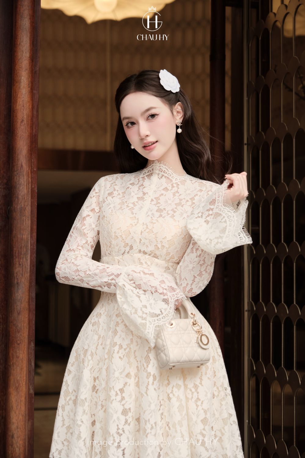 Cấu Trúc High-Neck & Scalloped Edge: Cổ cao thanh lịch phối cùng gấu tay và gấu váy cắt răng cưa (Scalloped) tinh xảo, tôn vinh nét kín đáo nhưng vô cùng quyến rũ và đài các.