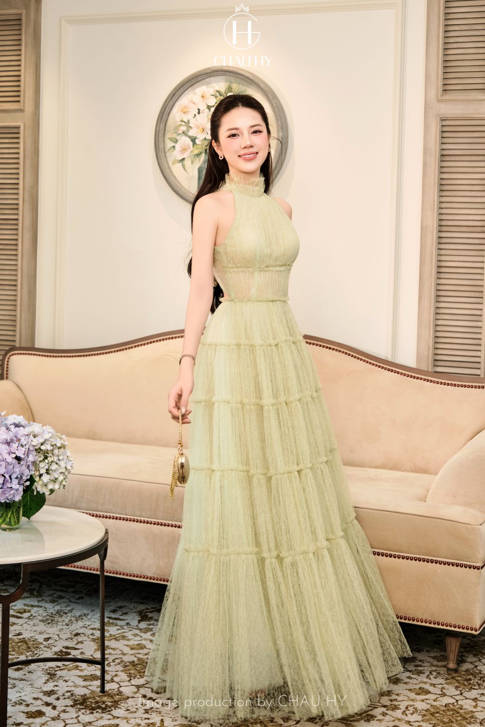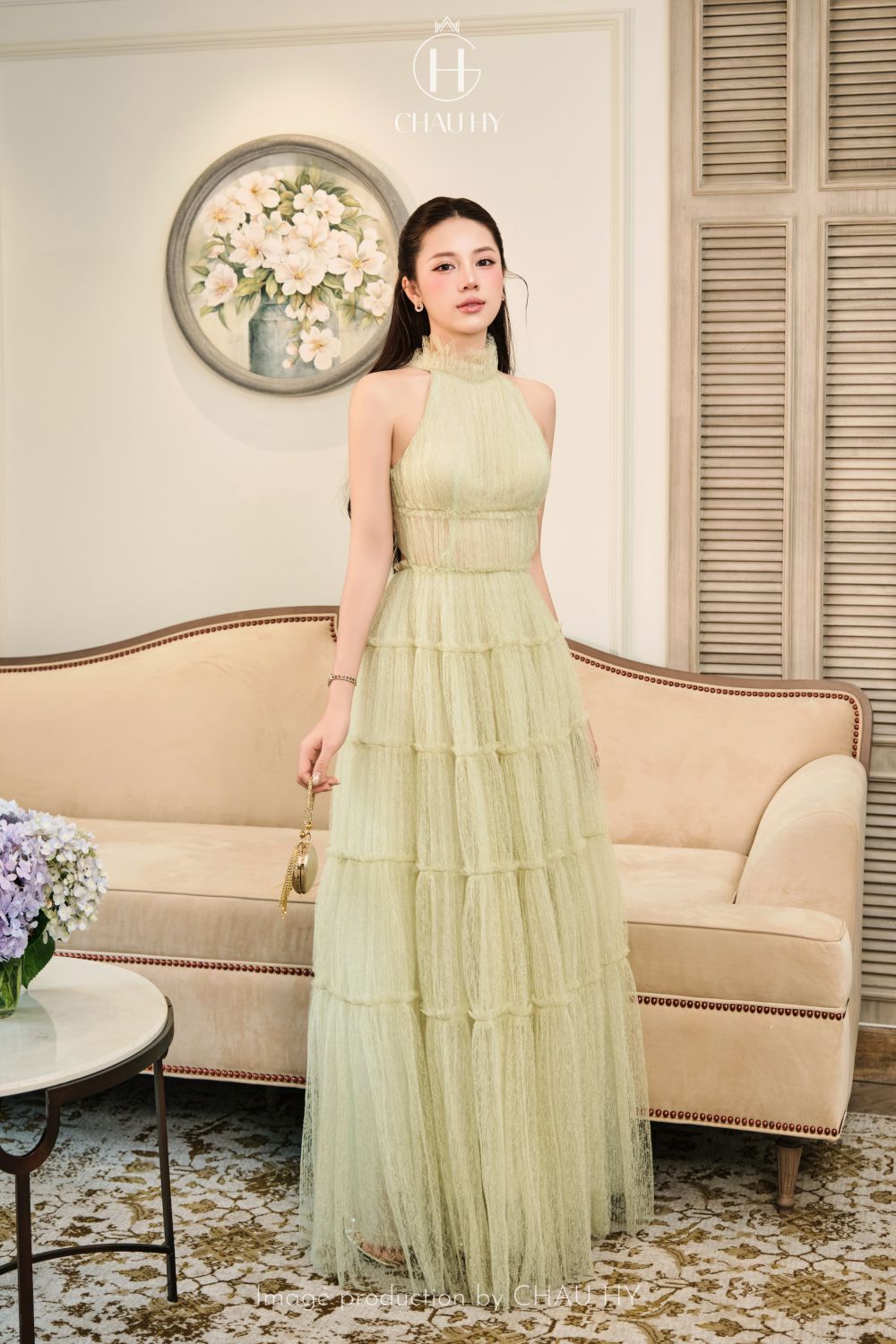 Thiết Kế Ruffled Halter-Neck: Chi tiết cổ yếm xếp nhún tinh xảo không chỉ giúp khoe khéo bờ vai trần mảnh dẻ mà còn tạo điểm nhấn gương mặt rạng rỡ, mang lại vẻ ngoài trẻ trung nhưng vô cùng quý phái.