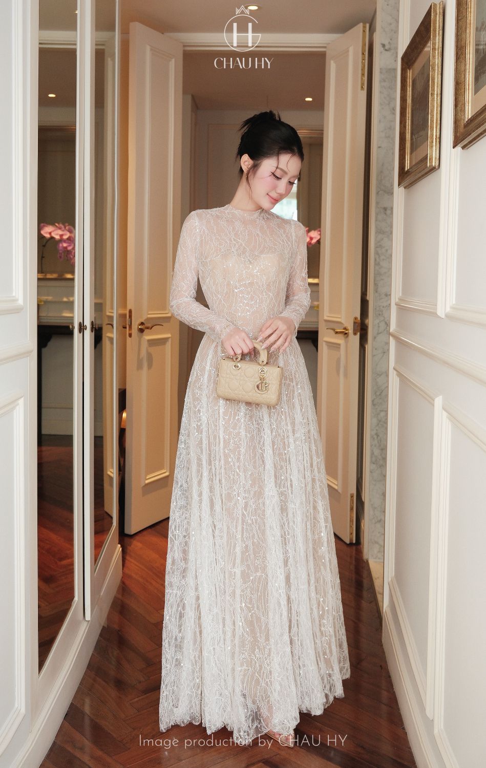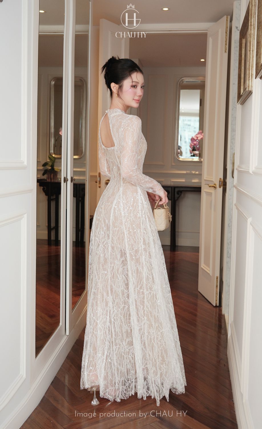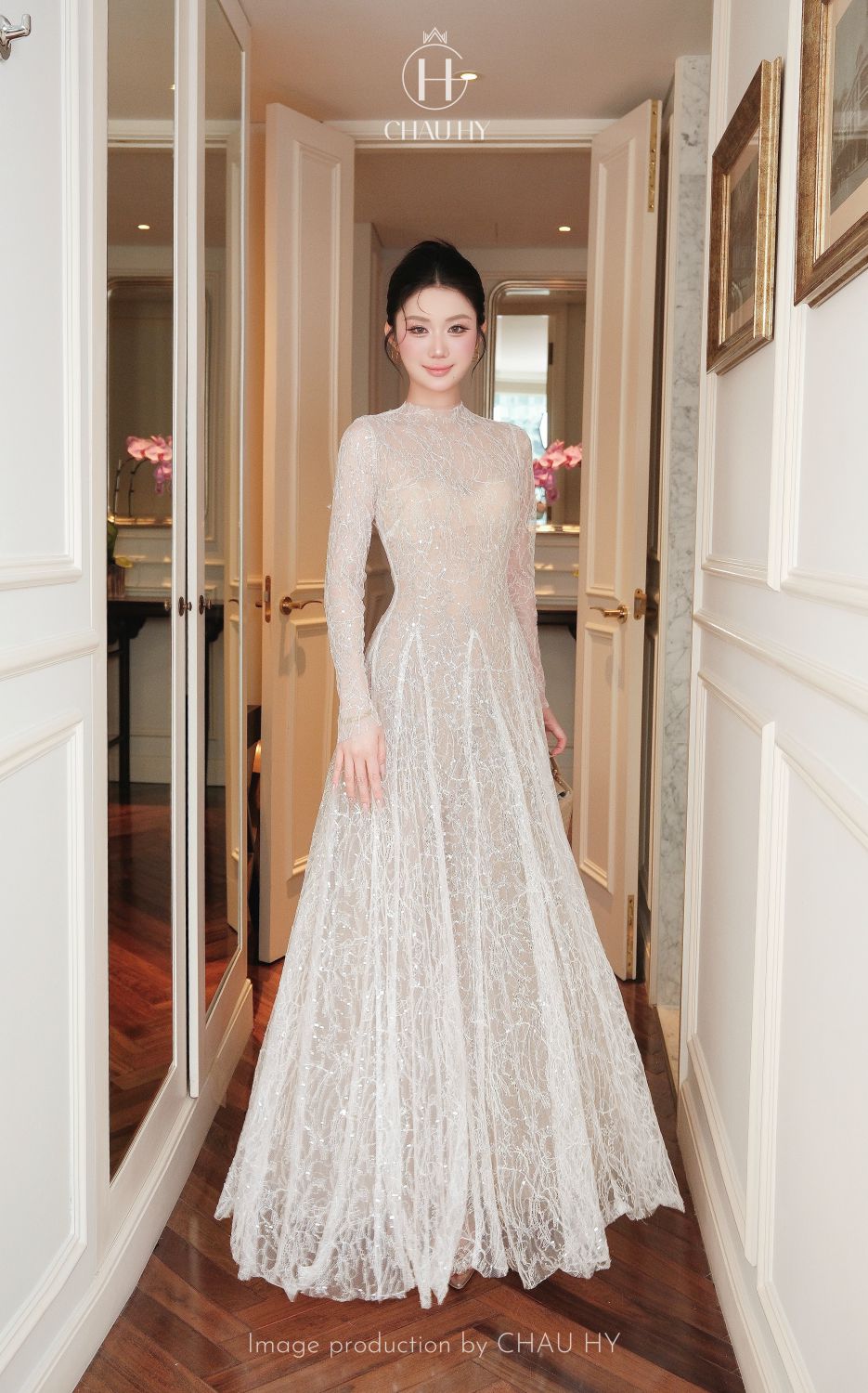 Tái định nghĩa vẻ đẹp vĩnh cửu với The Eternal Glow. Sự kết hợp giữa phom dáng kín đáo phong cách Hoàng gia và chất liệu ren kim sa lấp lánh kiến tạo nên một diện mạo trang trọng, thanh cao nhưng vẫn đầy lôi cuốn cho quý cô trong những thời khắc quan trọng nhất.