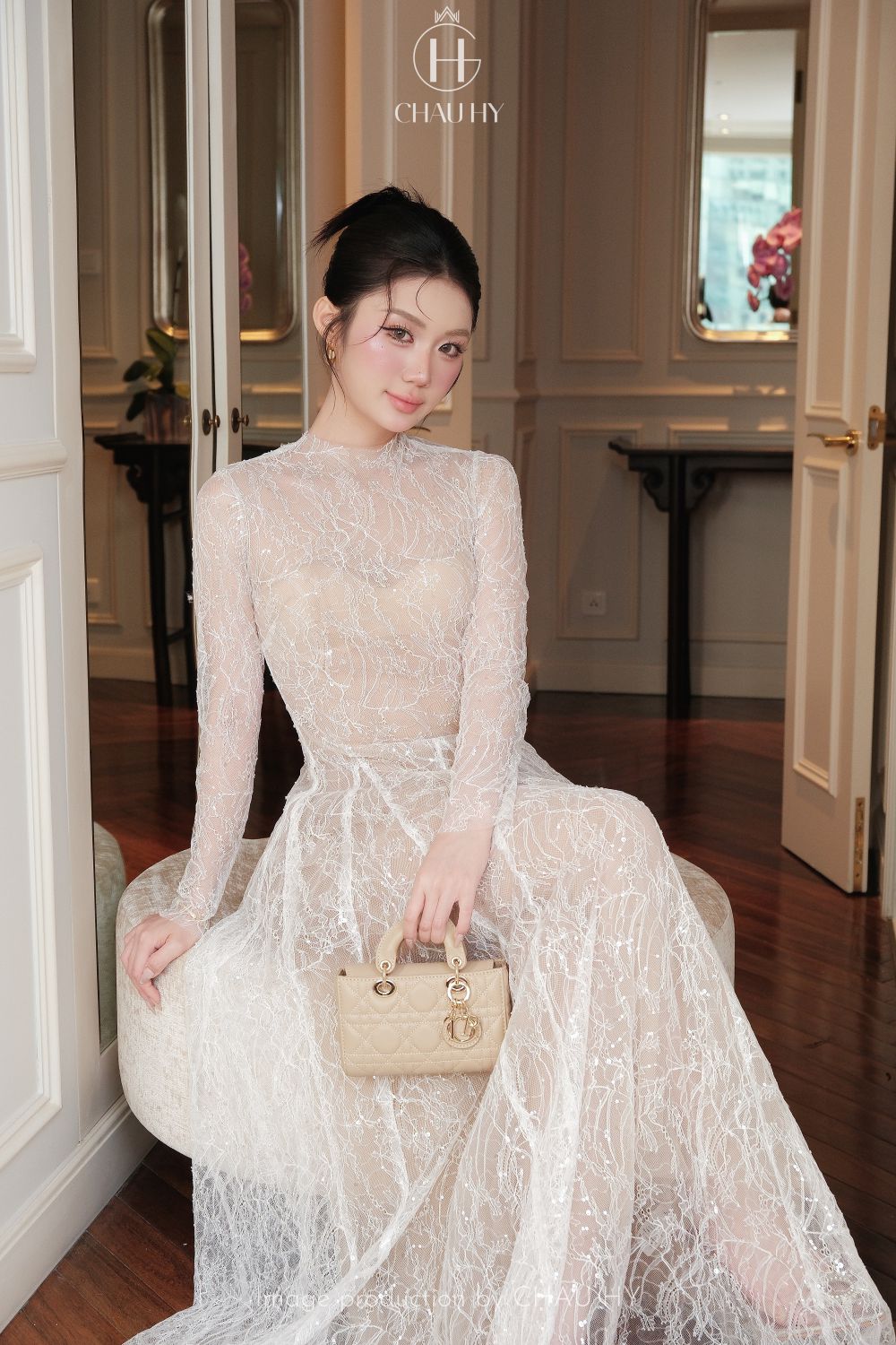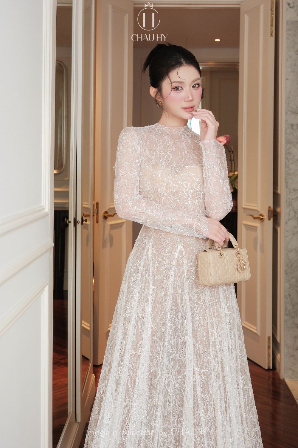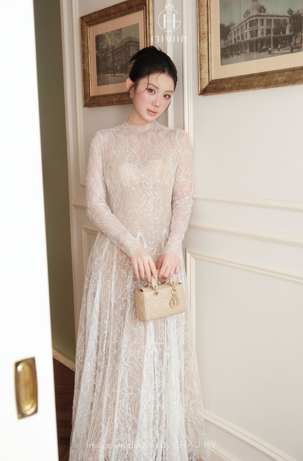 Tái định nghĩa vẻ đẹp vĩnh cửu với The Eternal Glow. Sự kết hợp giữa phom dáng kín đáo phong cách Hoàng gia và chất liệu ren kim sa lấp lánh kiến tạo nên một diện mạo trang trọng, thanh cao nhưng vẫn đầy lôi cuốn cho quý cô trong những thời khắc quan trọng nhất.